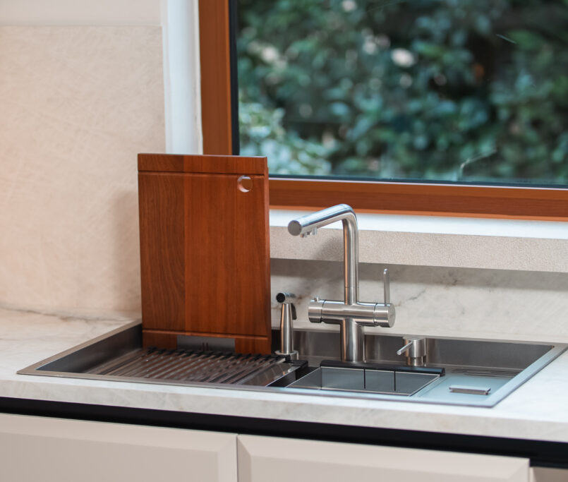 Crauf Lusso, yalnızca bir evye değil; aynı zamanda bir tasarım öğesidir. Köşelerindeki yumuşak geçişler, parlak yüzey dokusu ve minimalist çizgiler, mutfağın genel estetiğine katkı sağlar. Modern tasarımı, sade ama güçlü bir görünüm yaratır.