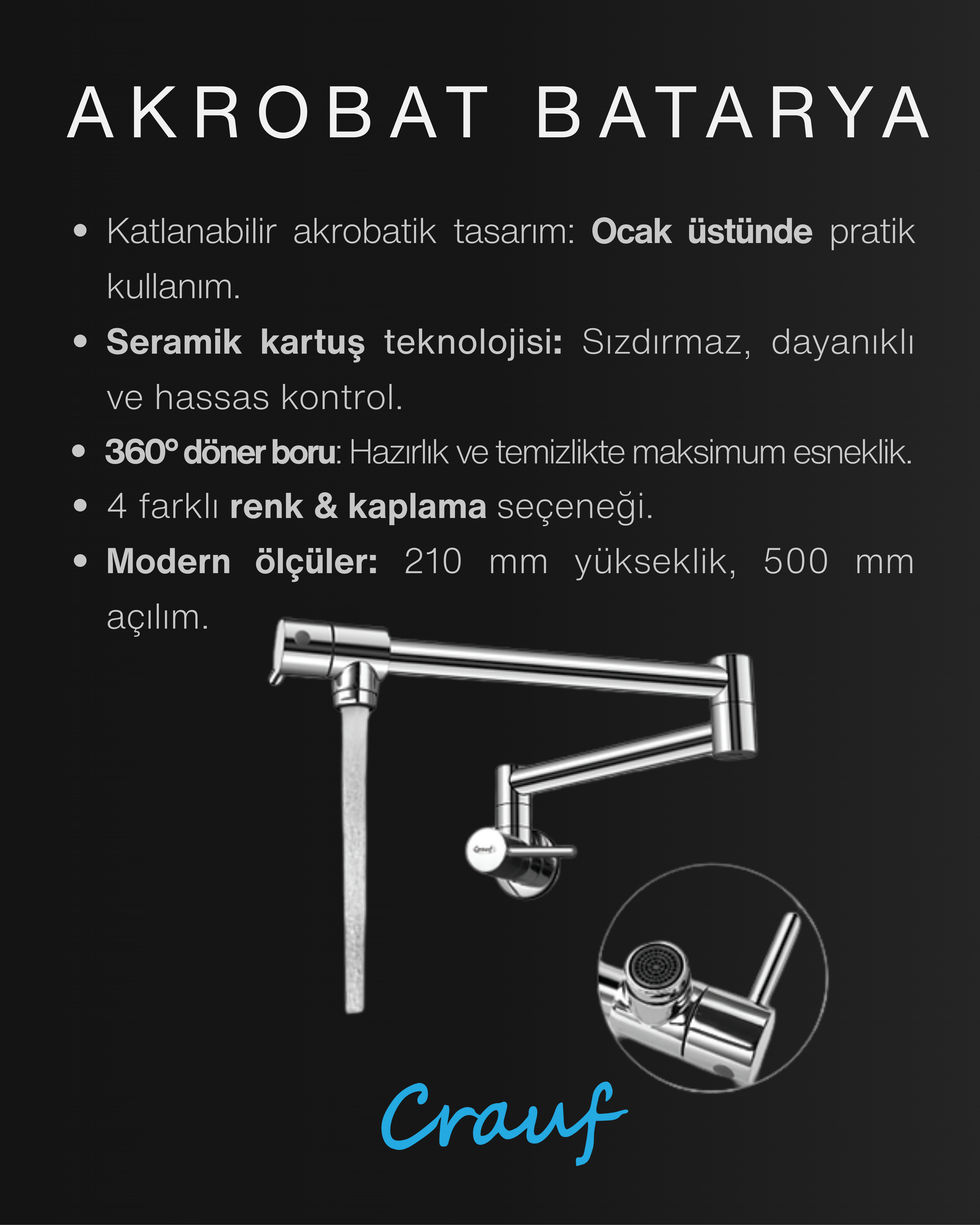 Crauf olarak, Türkiye’nin dört bir yanında 300’ü aşkın bayiimiz ve 10 yıla varan garanti güvencemizle, mutfağın kalbi olan evye–batarya uyumunu en yüksek seviyede sunmayı hedefliyoruz. Titanyum kaplama teknolojisi, estetik renk seçenekleri, modern tasarımlar ve güçlü mühendisliğin bir araya geldiği ürünlerimiz, kullanıcıların hem stil hem de performans beklentilerini karşılamak için özel olarak geliştiriliyor.