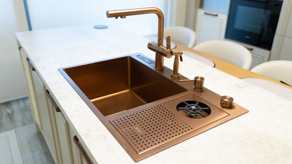 Altın, bakır ve mat siyah gibi PVD kaplama yüzeylere sahip tek gözlü, derin ve keskin hatlı evyeler modern mutfaklarda en şık seçenekler olarak görülür. Workstation tarzındaki modeller hem profesyonel görünüm hem de fonksiyonellik sunduğu için şıklık anlamında öne çıkar. Tasarım trendlerine göre altın veya bakır tondaki ince kenarlı evyeler son dönemin en çok tercih edilen modelleridir.