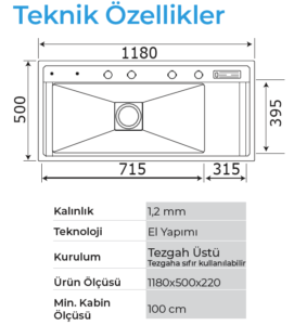 118 cm’lik Mutfak Üssü: Tek Hazne, Sınırsız Alan Lusso 1080, 118 cm’lik devasa gövdesi ve özel "Mega Basamak" alanı ile mutfağınızı profesyonel bir şef istasyonuna dönüştürür. Hazırlık, doğrama ve çözdürme işlemlerini tezgahı kirletmeden, doğrudan eviyenin geniş ıslak çalışma alanında çözmenizi sağlar.