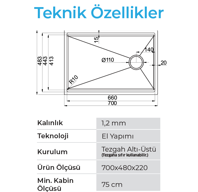 Crauf Vertice 4870 | 70cm Geniş Workstation Çelik Evye - 5 Renk
