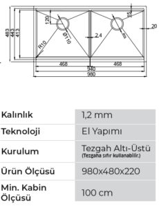 Crauf Vertice 4898A | 98x48 cm XXL Çift Gözlü (Double) Workstation Eviye