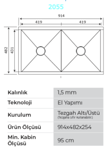 Crauf Vertice Plus 2055 | 91.4cm Eşit Çift Gözlü Endüstriyel Workstation Eviye