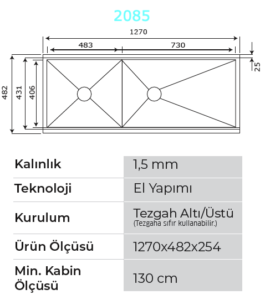 Crauf Vertice Plus 2085 | 127cm (50") Asimetrik Çift Gözlü Workstation Eviye
