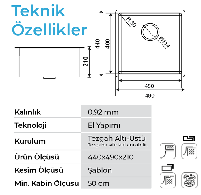 Montaj Önerisi: Kavisli tasarım nedeniyle tezgâh kesiminin ürün referans alınarak yapılması tavsiye edilmektedir.